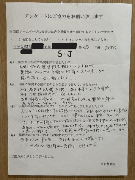 当院に来られている方のお客様の声(アンケート)を掲載させてもらい、当院に興味を持っておられる方、来院したいけど不安がある方、どのような方が来ているのか知りたい・・・など、知りたいことが山ほどあると思います。 来る来ないは別として、当院がどういう所かを知っていただき、来院をお考えの方の参考になればという思いからこのカテゴリーを開設しました。 いろいろな治療院がある中、当院では掲載いただいたほとんどの方が症状は改善しているけど定期的に何年も来られている方を対象に掲載しています。 ここに当院が考える皆様に何かを感じ取ってもらいたい事があるのです。 それは、調子がいいのになぜ長期間来院を続けているのか? それは、年齢を重ねていく上で、どのようにお身体と向き合っていくのかの考え方と、ご自身のお身体に対していたわりを持って生活できるかを確認してもらっています。 この方は、以前にもこのアンケートを掲載させてもらった方ですが、今現在の様子を今回再アップさせてもらいました。 入間市 S.J様 女性 70才代 ![]() この方は、当院に来院されて4年半になります。 来院当初は、右肘を骨折して手術されて治療院でリハビリをしたけれども肘の可動が良くならず、洗顔するのも出来ないぐらい痛みと可動制限から日常生活にも支障をきたしていました。 日に日にどんどん痛みも増して右腕から背中まで痛くて、この痛みを少しでも和らげて欲しいという思いから当院にたどり着きました。 ドクターからもこれ以上は良くならないと言われて半ば諦めていたところでの出会いでした。 定期的に施術をしていく中で、右肘の痛みは無くなり、生活動作全般的にほぼ問題なく出来るようになりました。(※使い過ぎたりすると肘周りにつっぱり感や張り感が出てきますが、年々その頻度や感じ方も減っています。) それにも増して、お身体に起きていたアキレス腱オペ後の後遺症改善、右臀部の痛みの解消など主訴でない部分も良くなっていきました。 でも肘には金具が入っているためどうしても完全な正常可動が出ないためかばう動きが残存して、どうしてもお身体を悪い方向へ向かわせてしまいます。 だからこそ、ご自身もそのことを十分理解していて以前のような状態に戻したくないという思いから今現在も定期的に施術をしています。 痛み自体はほとんどありませんが、まだまだ肘の可動域改善と、全身のお身体のメンテナンスに重点を置いて2人3脚で頑張っています。 他のお客様アンケートをご覧になりたい方は ⇩⇩⇩ 当院にご興味のある方、施術をご希望の方はご連絡下さい。 □■□■□■□■□■□■□■□■□■□■□■□■□■□■□■□■□■□ ◆肩こり、不定愁訴、慢性腰痛、膝痛などでお悩みの方 自費専門百彩整骨院ホームページ URL 施術のご予約は、LINEからが便利です まずは、下記のLINE「友だち追加」からID検索してお友達登録してね。 QRコード ![]()