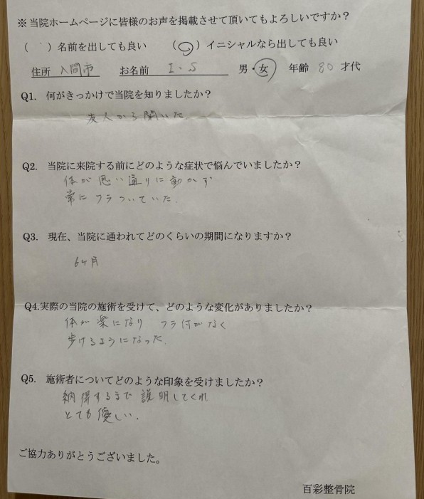 当院に来られている方のお客様の声(アンケート)を了承のもと、ブログにて掲載させていただいています。 当院に興味を持っておられる方、来院したいけど不安がある方、どのような方が来ているのか知りたい・・・など、興味はあるけど不安。でも知りたいことが山ほどあるのではないかと思います。 当院に来る来ないは別として、当院がどういう所かを知っていただき、このような症状でも諦めなくていいんだという前向きな気持ちになってもらえればと思っています。 そして来院をお考えの方の背中を一押ししてあげれればという思いからこのカテゴリーを開設しました。 いろいろな治療院がある中、当院では掲載いただいたほとんどの方が症状は改善しているけど定期的に何年も来られている方を対象に掲載しています。 ここに当院が考える皆様に何かを感じ取ってもらいたい事があるのです。 それは、調子がいいのになぜ長期間来院を続けているのか? それは、年齢を重ねていく上で、どのようにお身体と向き合っていくのかの考え方と、ご自身のお身体に対していたわりを持って生活できるかを確認してもらっています。 入間市 I・S様 女性 80才代 ![]() この方は、以前は別の治療院に通われていましたが、当院のお客様の紹介がきっかけで令和6年4月~今現在も定期的に来院されています。 来院当初は、アンケートにも記載されていた通り体が思うように動かず歩行時には常にふらついていたのが一番の悩みでした。 他にも、背中~腰、両足にかけて鈍痛や違和感を常に感じていました。 そのせいか、転倒の心配や症状の悪化を懸念してあまり歩かなくなり外出も控える生活が多くなっていました。 施術を開始してからは、今まで80年近く溜めたお体の異常部位を取り除き、正常な状態に戻すような施術を継続的にしています。 施術以外での日常生活において、基本的には症状が落ち着くまでは必要最低限の生活動作に留めてもらい、筋力訓練的なものはほとんどしていません。 意識してもらっているのは、正しい歩行と簡単なリセット体操のみです。 今では、痛みは落ち着き、筋力訓練などしていないにもかかわらず歩行時の不安定感もご本人様が良くなったと言えるぐらい安定した状態で生活出来るまでになりました。 お体の状態も良くなってきたため、少しずつ強度を上げた生活をしていくように指導しながら経過を観察しています。 当院にご興味のある方、施術希望の方はご連絡下さい。 □■□■□■□■□■□■□■□■□■□■□■□■□■□■□■□■□■□ ◆肩こり、不定愁訴、慢性腰痛、膝痛などでお悩みの方 自費専門百彩整骨院ホームページ URL 施術のご予約は、LINEからが便利です まずは、下記のLINE「友だち追加」からID検索してお友達登録してね。 QRコード ![]()