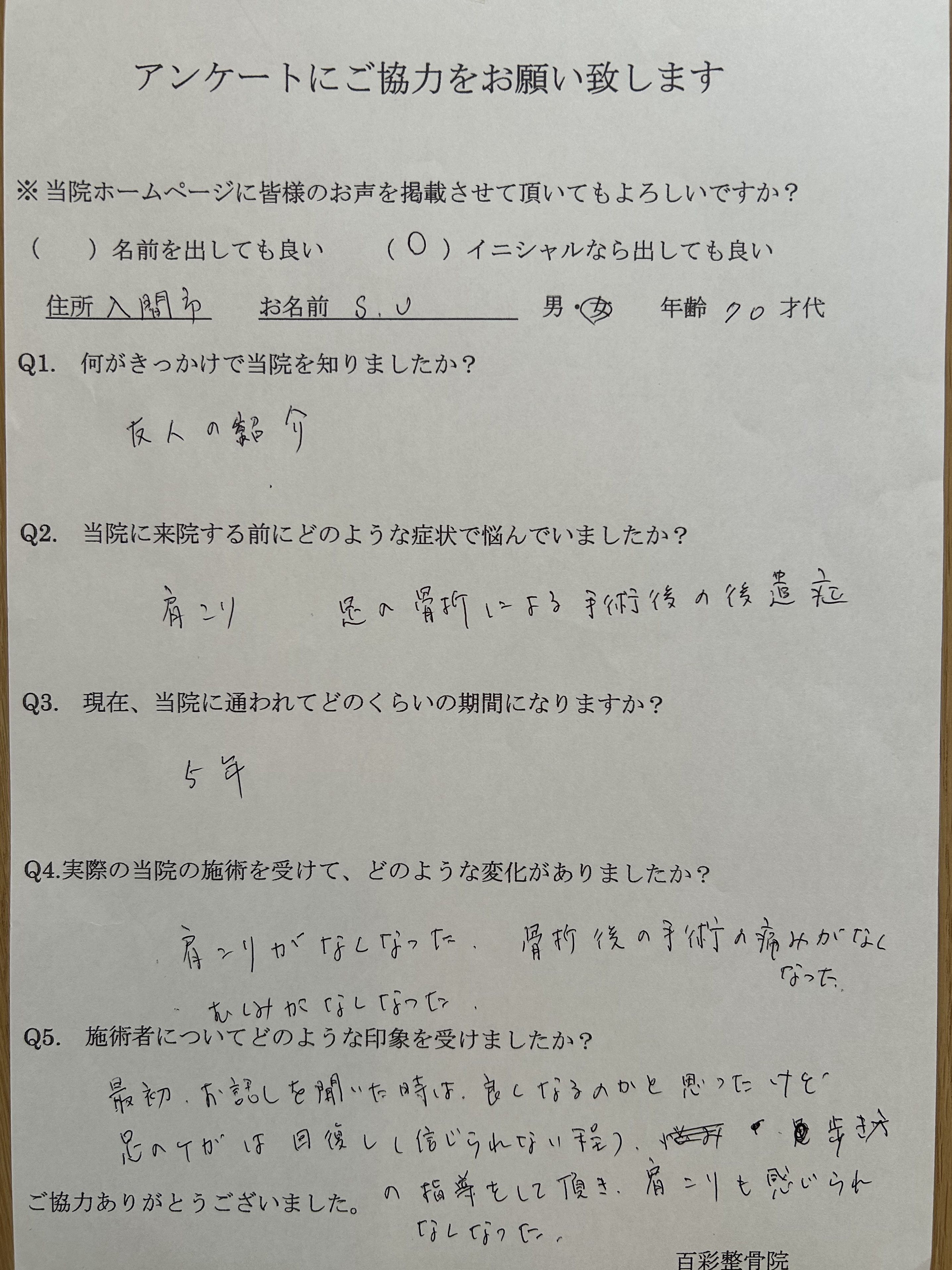 当院に来られている方のお客様の声(アンケート)を了承のもと、ブログにて掲載させていただいています。 当院に興味を持っておられる方、来院したいけど不安がある方、どのような方が来ているのか知りたい・・・など、興味はあるけど不安。でも知りたいことが山ほどあるのではないかと思います。 当院に来る来ないは別として、当院がどういう所かを知っていただき、このような症状でも諦めなくていいんだという前向きな気持ちになってもらえればと思っています。 そして来院をお考えの方の背中を一押ししてあげれればという思いからこのカテゴリーを開設しました。 いろいろな治療院がある中、当院では掲載いただいたほとんどの方が症状は改善しているけど定期的に何年も来られている方を対象に掲載しています。 ここに当院が考える皆様に何かを感じ取ってもらいたい事があるのです。 それは、調子がいいのになぜ長期間来院を続けているのか? それは、年齢を重ねていく上で、どのようにお身体と向き合っていくのかの考え方と、ご自身のお身体に対していたわりを持って生活できるかを確認してもらっています。 入間市 S・U様 女性 70才代 ![]() この方は、当院に来院してから5年半が経ちました。 来院のきっかけは、足首の骨折をして手術をして病院でリハビリを受けていたのですが、一向に痛みが改善されず歩いても痛いという状態が変わらず良くしたいということで来院されました。 来院当初は、痛みが強いのに何故リハビリと称して歩いているのか尋ねると、「使わないと良くならないよ」と言われていたので痛くても頑張って歩いていたとおっしゃいました。 当院では、痛みがある時は基本的に安静にすることが大事であることを伝え、日常生活では必要最低限の動きに留めてもらうようにしてもらい、施術で足の浮腫み、炎症を早く引かせるための施術を開始しました。 それと重度の肩こり症だったことや気象病もあり手術後の後遺症の施術をメインにしながら同時に肩こり、気象病にも対応した施術を続けてきました。 施術から6ヶ月後には、痛みはかなり軽減し、浮腫み感も減り足首を動かすときのつっぱり感が残っているものの歩き方がかばう歩き方から正常歩行へと良くなりました。 1年後には、手術後後遺症も過度に足を使い過ぎるとつっぱり感や多少の浮腫み、鈍痛が出ることがありました。 重度の肩こりはというと、ほぼ解消されました。 気象病も以前よりだいぶ改善し、天気が悪い日でも症状が出ない日が多くなっています。 今現在もこれらの症状を出さないために、定期的にお体の体質改善を求めて月1回のペースで来院してくれています。 生きる=年々体は老いていき、回復力も低下して悪い方向にしか進みません。 それをいかに少しでも良い状態に持っていくかが当院の役目です。 ただそのためには、お客様の協力、自分の体は自分で守るという意識がすごく大事です。 当院では、施術、生活環境、動き、体操、歩行など総合的な観点から皆様のお体のサポートをさせてもらっています。 当院にご興味のある方、施術希望の方はご連絡下さい。 □■□■□■□■□■□■□■□■□■□■□■□■□■□■□■□■□■□ ◆肩こり、不定愁訴、慢性腰痛、膝痛などでお悩みの方 自費専門百彩整骨院ホームページ URL 施術のご予約は、LINEからが便利です まずは、下記のLINE「友だち追加」からID検索してお友達登録してね。 QRコード ![]()