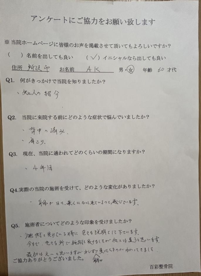 当院に来られている方のお客様の声(アンケート)を了承のもと、ブログにて掲載させていただいています。 当院に興味を持っておられる方、来院したいけど不安がある方、どのような方が来ているのか知りたい・・・など、興味はあるけど不安。でも知りたいことが山ほどあるのではないかと思います。 当院に来る来ないは別として、当院がどういう所かを知っていただき、このような症状でも諦めなくていいんだという前向きな気持ちになってもらえればと思っています。 そして来院をお考えの方の背中を一押ししてあげれればという思いからこのカテゴリーを開設しました。 いろいろな治療院がある中、当院では掲載いただいたほとんどの方が症状は改善しているけど定期的に何年も来られている方を対象に掲載しています。 ここに当院が考える皆様に何かを感じ取ってもらいたい事があるのです。 それは、調子がいいのになぜ長期間来院を続けているのか? それは、年齢を重ねていく上で、どのようにお身体と向き合っていくのかの考え方と、ご自身のお身体に対していたわりを持って生活できるかを確認してもらっています。 所沢市 A・K様 女性 60才代 ![]() この方は、当院に来院して下さってから丸4年が経ちました。 介護関係のお仕事柄、お体全体に不調を訴えていました。 来院当時は、背中が丸くなってたため背中の痛みの主訴をはじめ、肩こり、股関節の可動域制限、若かりし日の足趾の骨折後遺症と症状が多岐にわたっていました。 アンケート用紙にも記載されているように、今までいろいろな治療院に行かれたみたいですが、当院との相性も良く、4年かけた今では背中の痛みも肩こりも骨折の後遺症も仕事量をコントロールすることで抑制出来ています。 また、来院当初と比べて、ダイエット効果もあり洋服のサイズダウンL→Sという嬉しい報告も受けています。 でも仕事柄、体への負担も大きく、仕事がハードになるほど背中の痛みを含めいろいろな所に症状が出やすくなるので、ご自身でも気をつけることと2週~3週間に1度の定期的な施術で安定した体を保っています。 この方は、ご自分のお体にものすごく大事にしている方なので、休日の過ごし方、仕事の仕方など当院のアドバイスをしっかり聞き入れて守ってくれています。 当院にご興味、施術希望の方はご連絡下さい。 □■□■□■□■□■□■□■□■□■□■□■□■□■□■□■□■□■□ ◆肩こり、不定愁訴、慢性腰痛、膝痛などでお悩みの方 自費専門百彩整骨院ホームページ URL 施術のご予約は、LINEからが便利です まずは、下記のLINE「友だち追加」からID検索してお友達登録してね。 QRコード ![]()