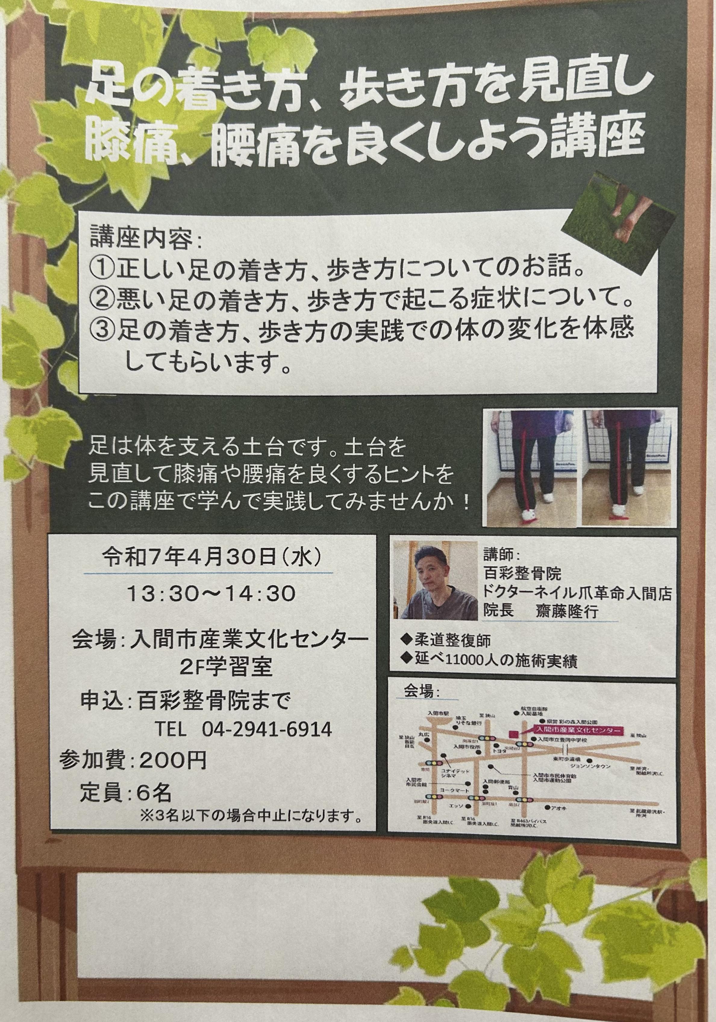 当院主催による、「足の着き方歩き方」講座を開催いたします。 先日、NHKでもトリセツという番組で足について放送していました。 足がいかに重要か、骨盤や背骨も大事だけど体を支える土台でもある足がどれだけ重要かが見直されている結果だと思います。 以下の画像に、講座の詳細を記載しておきました。 ご興味のある方、参加希望の方は、当院までお電話下さい。 ![]() 講座内容は、 ①正しい足の着き方、歩き方についてのお話 正しい足の着き方は、体を支える上での重要な土台になります。 正しい足の着き方で正しい歩行が出来るようになれれば腰痛、 膝痛、転倒予防などのリスク回避になります。 ここではその当院が考える正しい足の着き方、歩き方をご紹介します。 ②逆に、悪い足の着き方、歩き方をしているとどのようなことが起こりうるのか? また、悪い足の着き方、歩き方についてご説明いたします。 ③最後に正しい足の着き方、歩き方を簡単に実践していただきます。 その際、体の変化を感じてもらえればと思います。 以上のような内容で講座を進めさせてもらいます。 講座開催にあたり、最低開催遂行人数3名以下のは中止になります。 詳しい詳細やお問い合わせは、 百彩整骨院 TEL04-2941-6914まで |